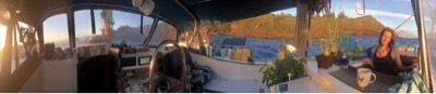 Aldebaran’s cozy cockpit is partially zipped up for the rain that went by on Monday/Tuesday, and the nip of the breeze at this latitude. After the rain passed, the wind switched from NW to SE (it’s all sideshore and uncomfortable, but it’s been light wind below 10knots). Note our Garmin nautical chart keeping track of our movement in the anchorage and depth, with one of three anchor drag alarms on Aldebaran. This is truly an astounding view to wake up to, especially happy to know we haven’t drifted overnight! Here’s Sabrina coming out of our rabbit hole with a cup of tea at the ready (our aft cabin is down that ladder)