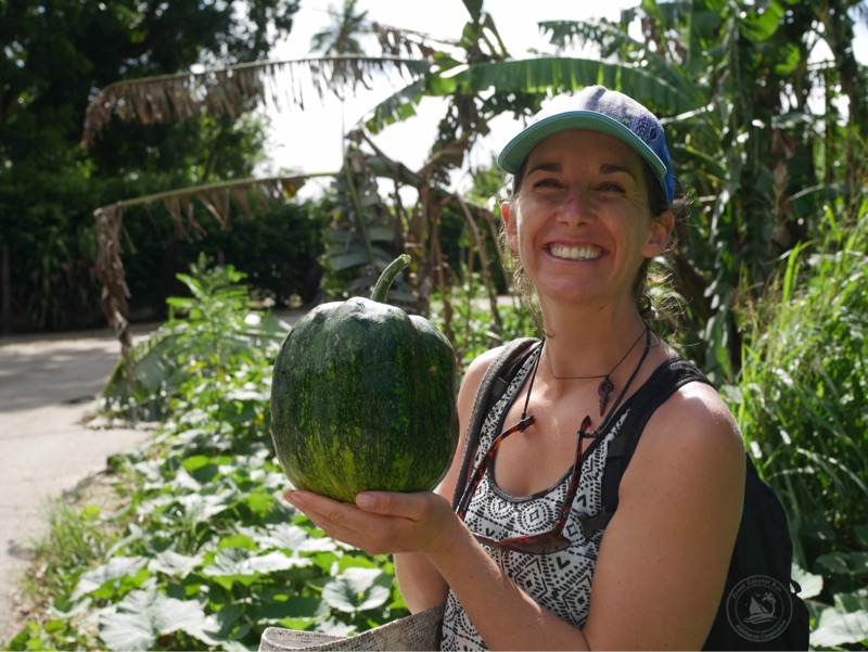 To make up for these costs, Gambiers fertile land has hidden treasures at little to no charge. One day we walked along the road, recognizing large green leaves with distinctive white markings. I paused and asked, could this be squash? We then spent the next hour wadding through the knee-high bushes looking for the hidden globes of squash. This is just like Easter Egg hunting! We returned to the boat with 7 large squash, which keep for a long time and make wonderful soup!