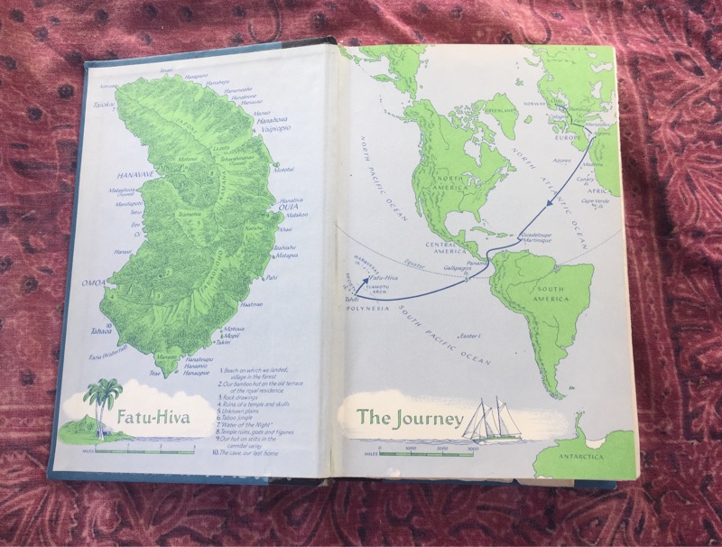 Photo: the inside cover of Thor Heyerdahl’s book, Fatu Hiva. Thanks to Annelise for gifting it to us, when she visited us in the Galapagos in March!
