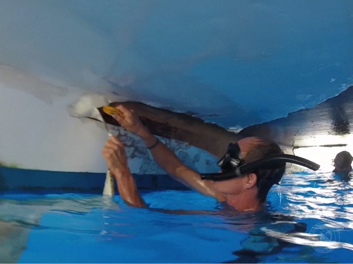 We discovered it during a swim break when the wind died. A large section of the boat’s fiberglass had been delaminated from the underside of the wing.