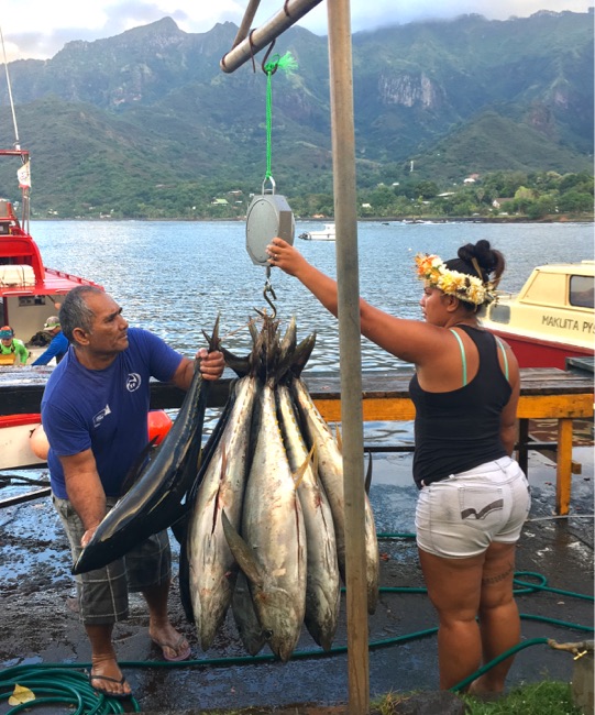 This is the largest sheltered bay in the Marquesas, and it is a little heaven for yachts. There is free wifi (unheard of!) at the snack bar right on wharf; the laundry is “only” $10-12 per load (in contrast Hiva Oa was double that cost); and the 5am veggie and fish markets are right next to the pier.