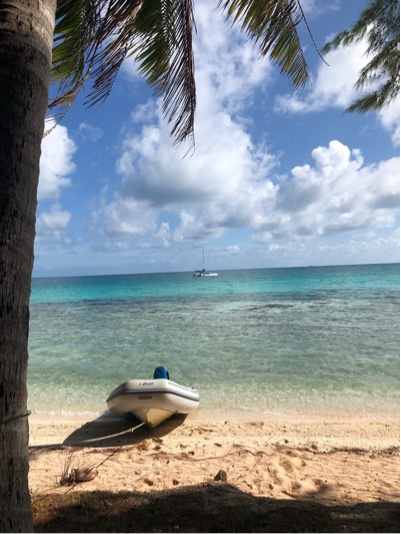 As such, we picked up Gary & Jonathan at the airport, walked across from the terminal to an open lot that led to the lagoon. Through the coconut trees, the cyan-blue water popped like a 3D cartoon, with Aldebaran at anchor and our faithful Lambordinghy tied on the beach.