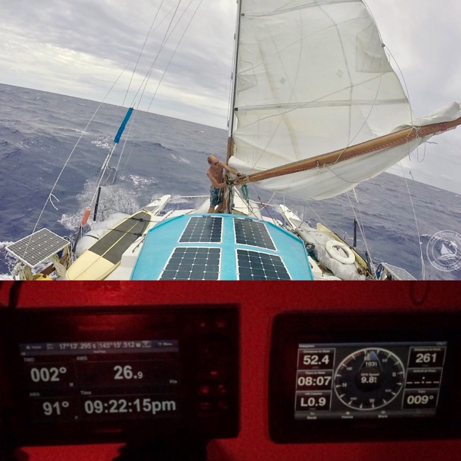Our hearts were pounding as waves crashed on the reef next to us, and a large swell rose behind us. Would it break on us? Would Aldebaran’s design as a forty-foot surfboard now be tested? I steered to starboard away from the peak of the lump approaching us, and Aldebaran began to surf down the swell, picking up speed from 6 to 8 to 10 knots. The wave was breaking 150ft away, which is just a stone’s throw! Fortunately, where we were, it didn’t get steep and break; the wave rolled under us. We had timed the sets well and entered into the lagoon. What a relief!