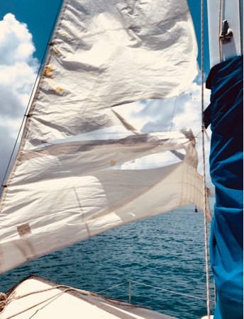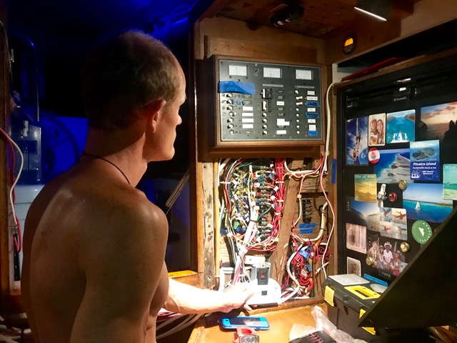 Sabrina at the bow with a portable VHF to communicate with Kristian steering the boat in the cockpit. Gary and Ethan kept watch for hazards on each side of the boat.
