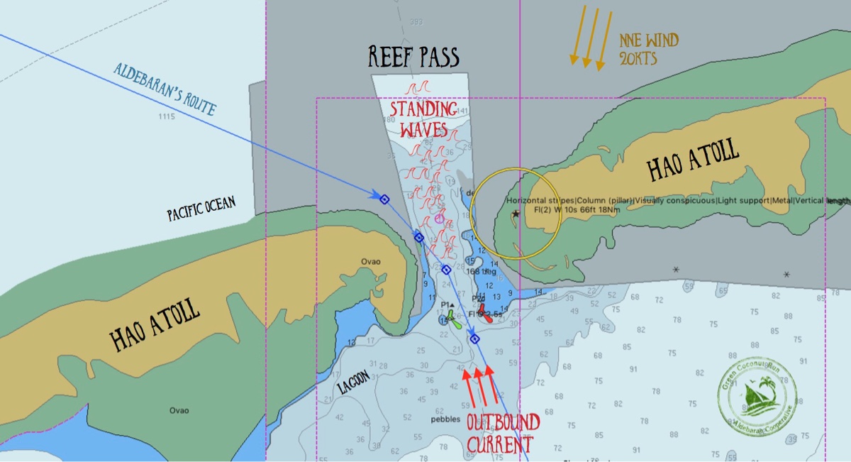 From afar in the lumpy seas, we watched the waves on the pass for 25 minutes. Eventually we gained confidence in the timing of the swell and pattern of breaking waves. We planned the approach at a diagonal angle to the pass, starting close to the western side and moving to mid channel.