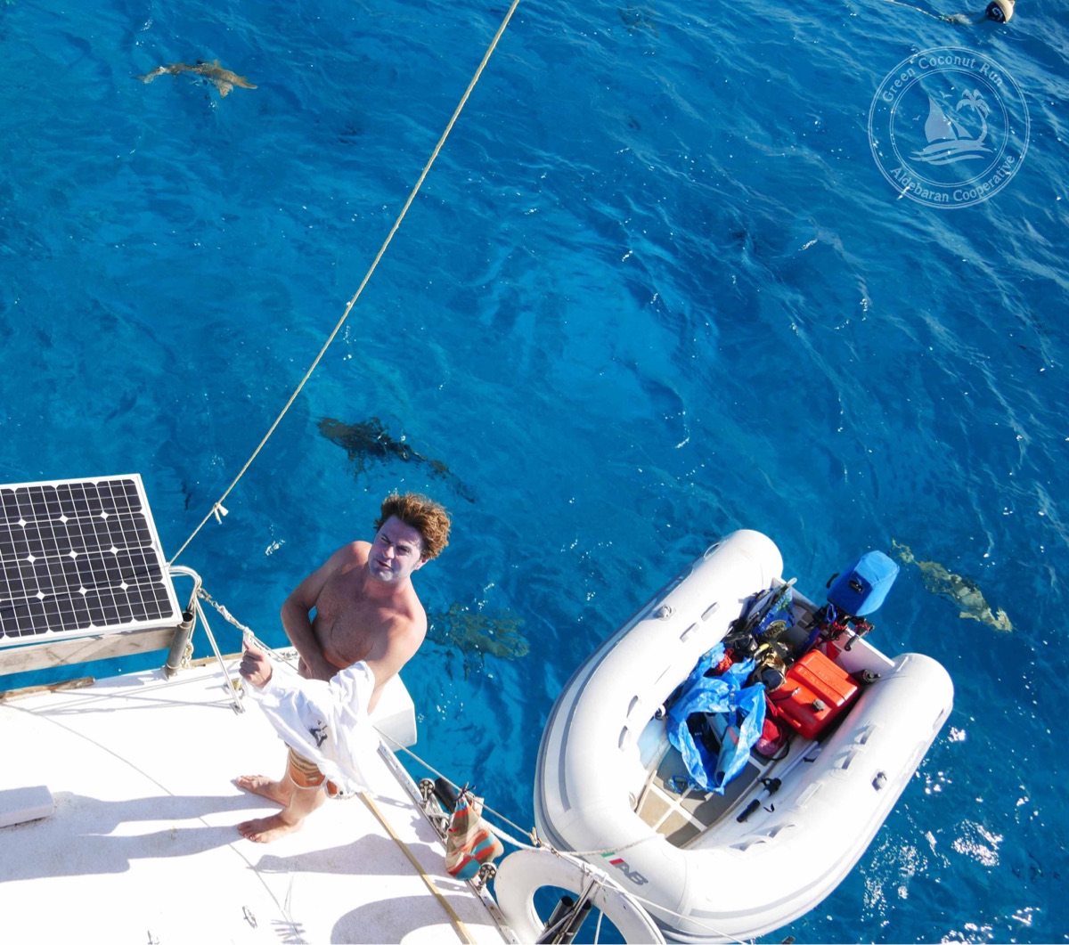 This photo illustrates the issues of “visibility”. The glare of the sun (left side of frame) makes going into the sun impossible, compared to where the sun is shining onto (right side of frame). Also compare this photo with the lighting in the photo above with Sabrina holding the VHF, which is into the sun — it is much darker and hard to see. Hence, we must always enter new reef passes and navigate inside unsurveyed lagoons with a favorable angle to the sun. Ideally, when the sun is high (10am-2pm is best) and also slightly behind to prevent glare, can we then see the hazardous shallow coral bommies. This ‘timely precision’ is hard to achieve on a sailboat, given the shifts in weather… making this one of the great challenges of navigating in Tuamotos archipelago.